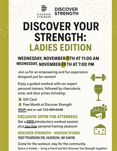 Join us for a fun and empowering women’s event! Enjoy a guided workout with our expert trainers, then relax with wine, charcuterie, and door prizes—including a Starbucks gift card and a free month at Discover Strength. Plus, everyone who attends receives a free introductory workout and 2 free personal training sessions!
