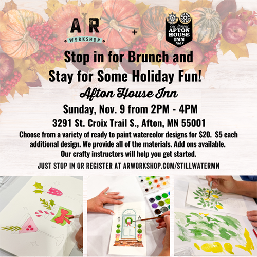 Join us for Watercolor Painting at The Afton House Inn on November 9th at 11:30 AM! Enjoy a relaxing morning of creativity with AR Workshop Stillwater — $20 for your first design and just $5 for each additional. All materials provided! No experience needed — just come, sip, and paint! Register at arworkshop.com/stillwatermn.